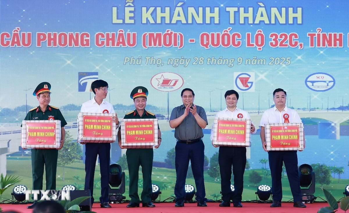 Thủ tướng Phạm Minh Chính tặng quà cho nhà thầu và các đơn vị thi công dự án kèo nhà cái vn88 Châu mới. Ảnh: Dương Giang/TTXVN