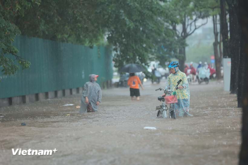 Hoàn lưu bão số 10 đã gây soi kèo nhà cái hôm nay lớn ở Thủ đô Hà Nội, gây ngập úng một số tuyến đường, khiến việc di chuyển của người dân gặp nhiều khó khăn. Ảnh: Hoài Nam/Vietnam+